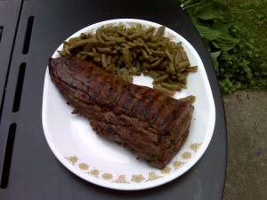 The tricky thing about this particular cut was that one end was very narrow and not very thick, while the other end was wide and about an inch and a half thick. This basically meant that one end of the tenderloin was at a nice medium well, while the other end was in the medium rare range (rare at the very center). However, it was amazing! I only ate about a third of it the first night, but finished it for lunch the next day (count it – that’s a pound and a half of beef in 18 hours; delicious, tender, tasty beef). I paired it with some green beans and a nice, cold Mountain Dew. Simply awesome. I’ll let you know how the duck turns out later on in the week.